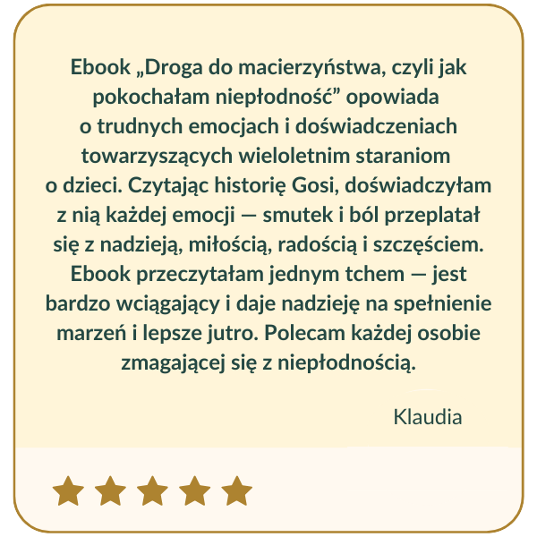 Bazując na moich wieloletnich zmaganiach z niepłodnością oraz doświadczeniu gabinetowym (podczas sesji 1:1 z klientkami), mogę śmiało stwierdzić, że etap, którego nie możesz pominąć przy staraniach o dziecko to efektywna praca z emocjami. W ebooku, który dla Ciebie napisałam, nawiguję Cię, krok po kroku, co masz zrobić, by wyciszyć gonitwę myśli,